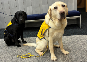 4月1日、本社ビルにルーク君が出社し、今回初出社であるファシリティドッグのアリエルちゃんと一緒に、1階受付横で心のバリアフリー推進活動を実施しました。