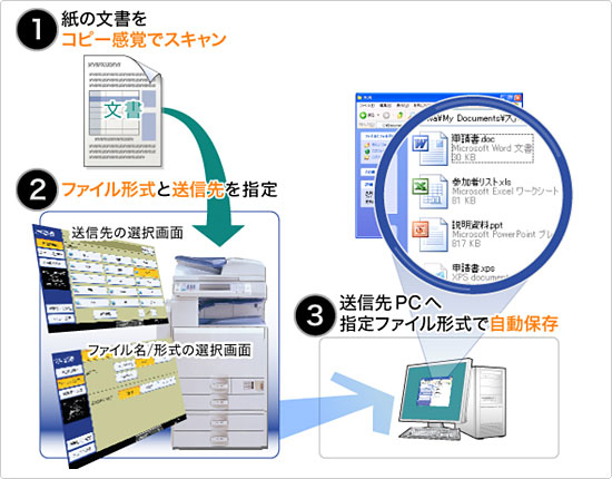![[Quickコンバート概要図] 1.紙の文書をコピー感覚でスキャン 2.ファイル形式と送信先を指定 3.送信先PCへ指定ファイル形式で自動保存](/corporate/release/2009/img/img_news2152.jpg)