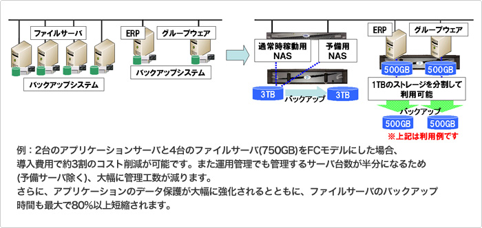 本パックにより、分散しているファイルサーバやアプリケーションサーバ領域を統合することができるほか、高度な冗長性やバックアップ機能により、業務継続が求められる基幹系システムなどで耐障害性に優れたシステムを実現します。さらに仮想化にも対応し、大容量データ管理の統合とあわせた運用管理コストの削減も可能です。