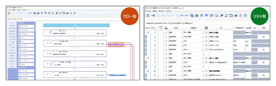 RPAに慣れていて複雑な業務の自動化をする方は、1画面でより多くのシナリオ情報が確認できる「リスト型」で効率よく作成できます。シナリオ作成途中でも、フロー型・リスト型はいつでも切り替えることができます。