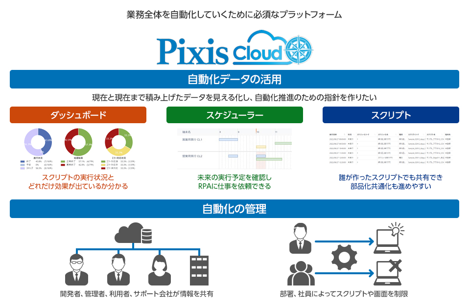 「Autoジョブ名人」は、RPAロボットの稼働状況が把握でき、さらにRPA活用の投資対効果も「見える化」できるクラウド統合管理プラットフォーム「Pixis Cloud」を搭載しています。
