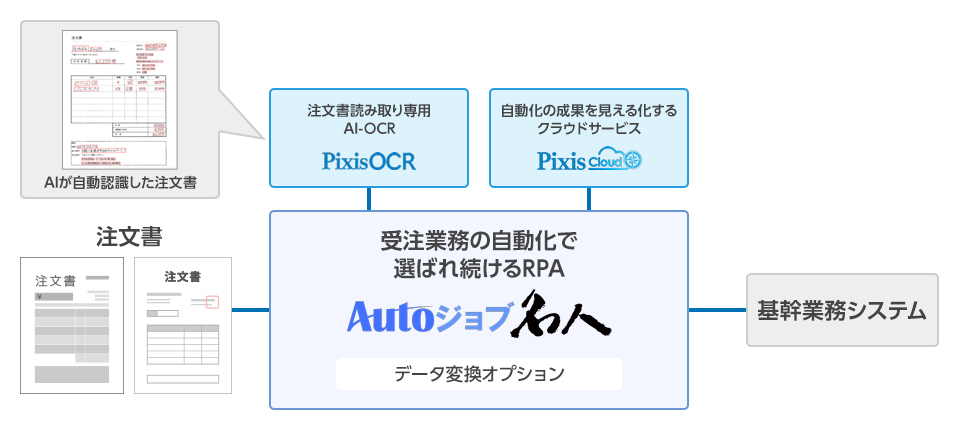 「Autoジョブ名人」に標準搭載している「Pixis OCR」は注文書の読み取りに特化しており、フォーマットごとに設定する必要がありません。そのため、注文書をアップロードすればそのまま文字認識をしてデータ化が可能です。後工程の業務がスムーズに回ります。