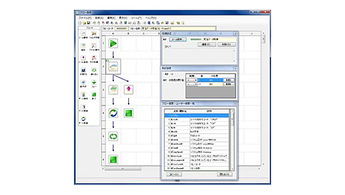 画面上でアイコンをつなげていくことで、自動化したい業務フローを簡単に設定できます。矢印をクリックすると、分岐条件の設定画面が表示されます。データベースの参照や外部プログラムの起動も行えます。