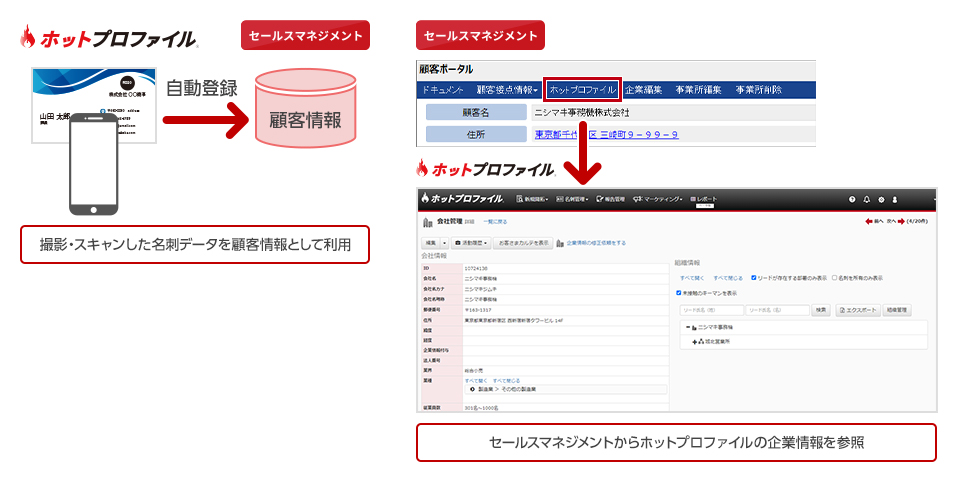 さらに「DX統合パッケージ セールスマネジメント」から「ホットプロファイル」で提供している企業情報を参照することができ、顧客情報の集約管理が一層進みます。