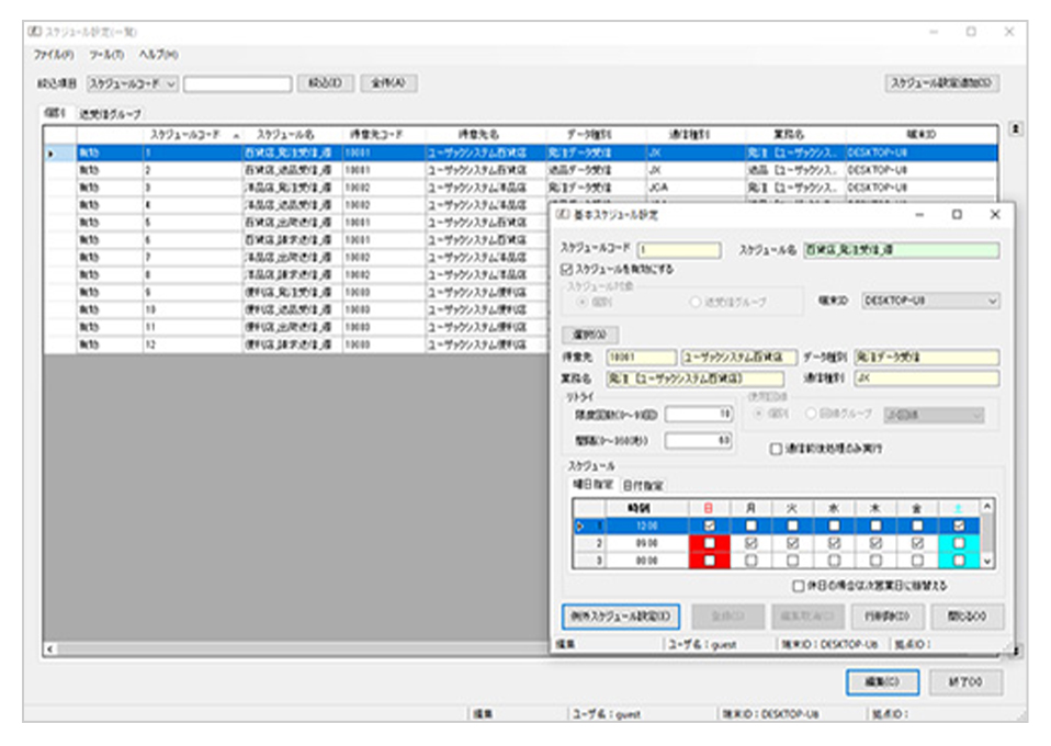 通信だけでなく、データ変換、基幹業務システムの取り込みプログラムの起動までを連続実行させることができます。また、自社の営業カレンダーに基づくスケジュール実行が可能です。日次業務は曜日と時刻、月次業務は日付(ひづけ)、月末の指定ができ、予定と実行・エラーなどの運用管理が行えます。