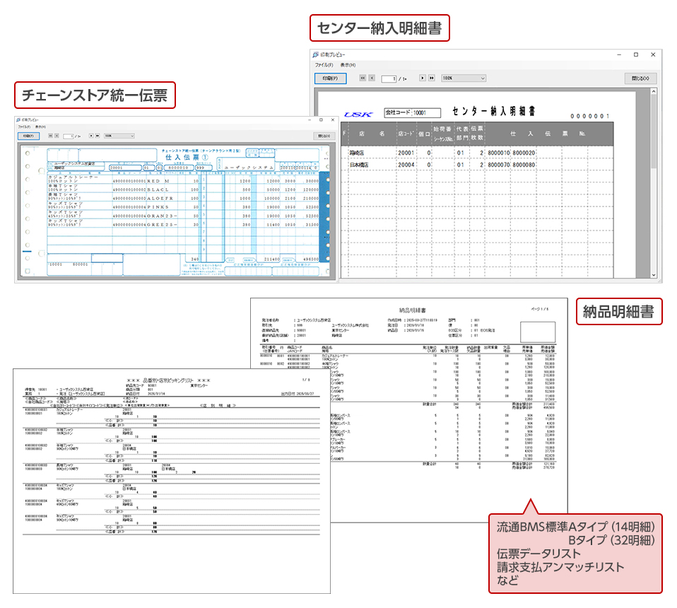 取引先指定の帳票の設計が簡単にできます。訂正があった場合に消し線を入れるなどの柔軟な対応も可能です。指定納品書、納入明細書に対応しています。また、チェーンストア統一伝票やセンター納入明細書の他に伝票データリストや納品明細書など、EDI関連業務に必要な各種帳票を発行できます。