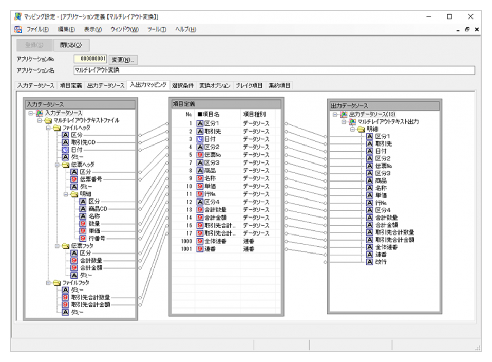 得意先ごとに異なるデータレイアウトを基幹業務システムの取り込みレイアウトに変換することが可能で、自社での開発ができるツールとなっています。流通BMSの基本メッセージおよびオプションメッセージはバンドルしています。JCA、流通BMSだけでなく、Web-EDIでダウンロードしたデータのレイアウト変換にもお使いいただけます。