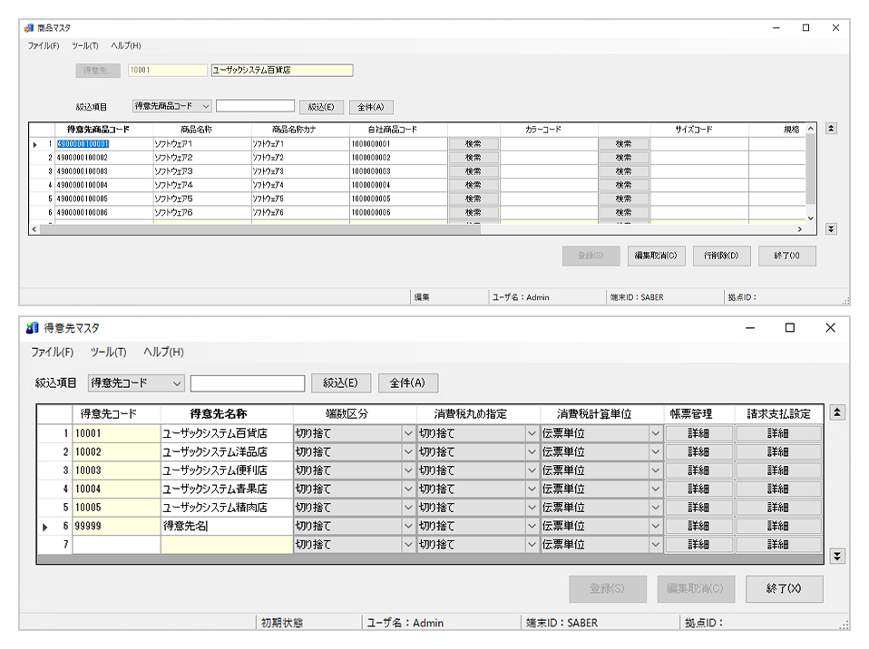 得意先マスター、店マスター、商品マスター、カラーマスター、サイズマスターなど、得意先のコードから自社コードに変換するためのマスターをご用意しています。