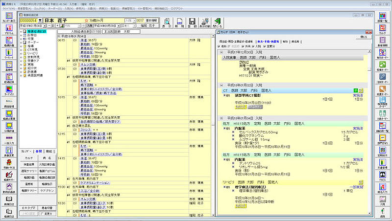 入院業務の起点となる「入院経過シート」では、医師の回診や病棟職員の日々の業務に必要な情報を1画面に集約し、入院患者様の状態や経過の把握と同時に、新規のオーダーや看護指示、実施情報の入力が可能です。検査結果の時系列表示やグラフ表示、カルテや各部門の記録の参照もスムーズに行えます。