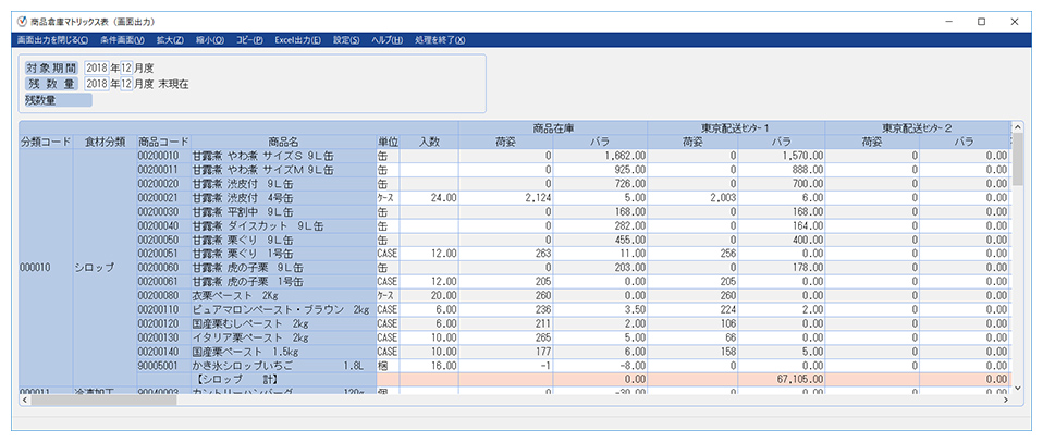 在庫数は「倉庫別」にも管理できます。「在庫一覧表」同様に「総バラ数」「荷姿別」「内訳別」「ロット別」に把握することができます。倉庫別の在庫一覧表のほかに、商品別にどの倉庫にどれだけ在庫があるかが確認できる「商品倉庫マトリックス表」も用意しています。