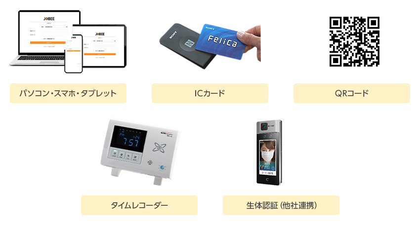PC・スマホ・ICカードなどの打刻に対応し、運用に合わせた柔軟な打刻環境を実現します。