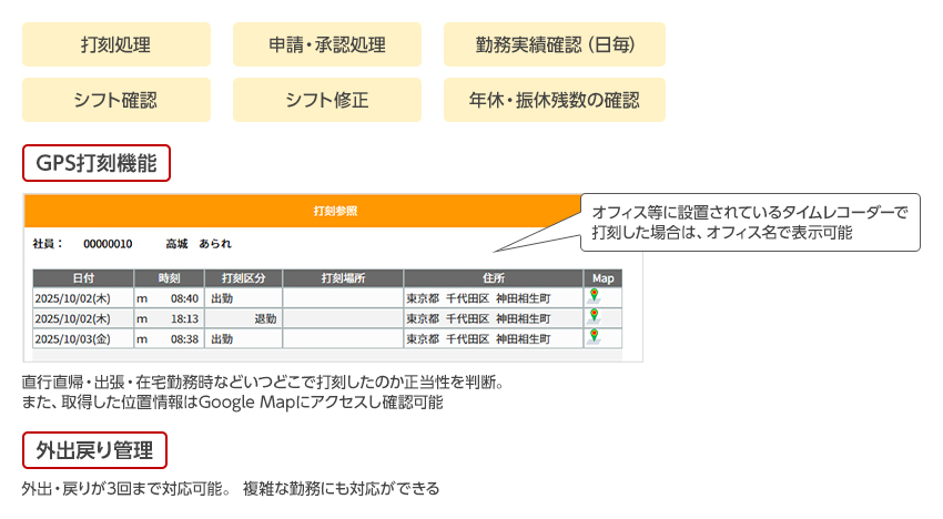 打刻、申請・承認、シフト修正などのさまざまな操作ができ、場所と時間を選ばない勤怠管理が可能です。また、GPS打刻機能により、勤務の正当性を担保します。