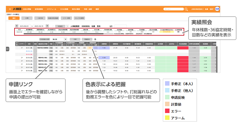 出退勤時刻・労働時間・残業時間等をリアルタイムで確認できます。勤務エラーの色分けや申請へのリンクなど、状況を一目で把握できる設計により、確認から是正対応までをスムーズに行えます。