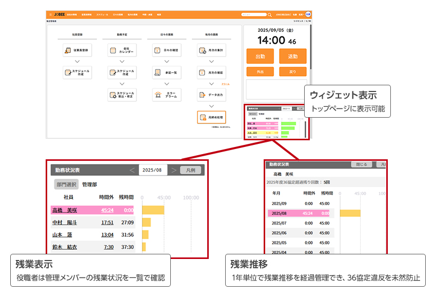 残業時間をリアルタイムで可視化し、36協定違反を未然に防止します。トップページのウィジェット表示で、日常的な管理を効率化します。