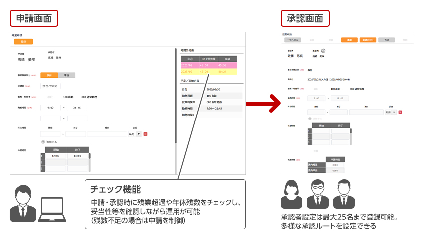 PC・スマホから各種申請・承認が可能です。残業超過や休暇残数を自動チェックし、適正な運用と業務効率化を支援します。承認ルートは最大25名まで設定可能で、柔軟なワークフローを構築できます。