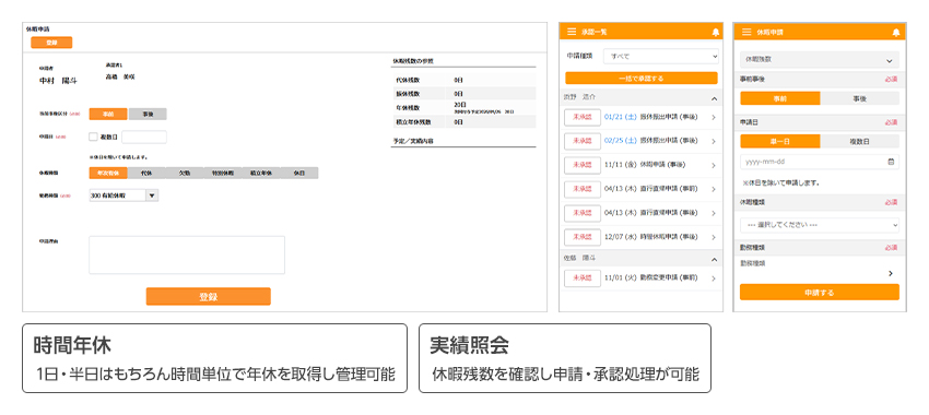 年休・代休・特別休暇など、各種休暇の申請・承認に対応します。時間単位取得や残数確認も可能で、適正な休暇管理を実現します。