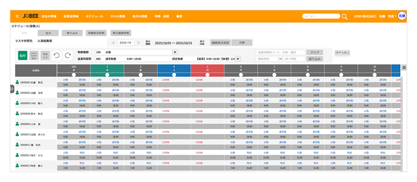 フレックス勤務・変形労働時間制・1日2セットの複数回勤務など、複雑なシフト管理に対応しています。スマホからのシフト修正、Excelで作成したシフト表の取り込みも可能です。