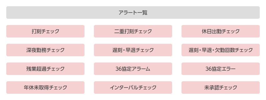 打刻漏れや残業超過、36協定違反、年休未取得などを自動でチェックすることができるため、労務リスクを未然に防止できます。