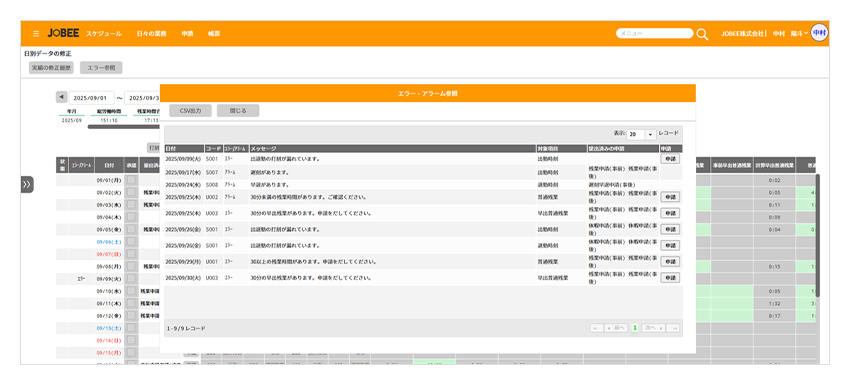 日別実績画面の起動時にアラームをポップアップ表示します。該当箇所からそのまま申請画面へ連携でき、確認から是正対応までをシームレスに行えます。