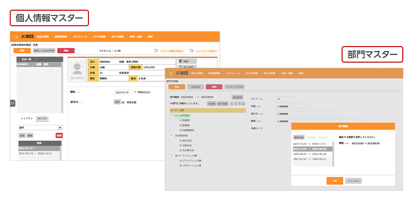 部門異動・職位変更の予約登録にも対応し、発令日以降は自動でマスターデータに反映します。正確性と効率性とを両立した組織運営を実現します。