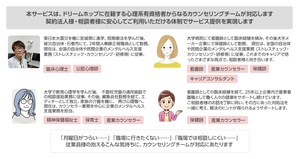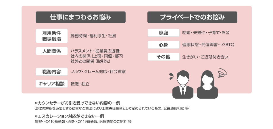 職場の悩みだけでなく、家族関係、育児、介護、自身の性格、借金など、あらゆる悩みに対応。「会社には言えない個人的な悩み」も外部の専門家が受け止めます。