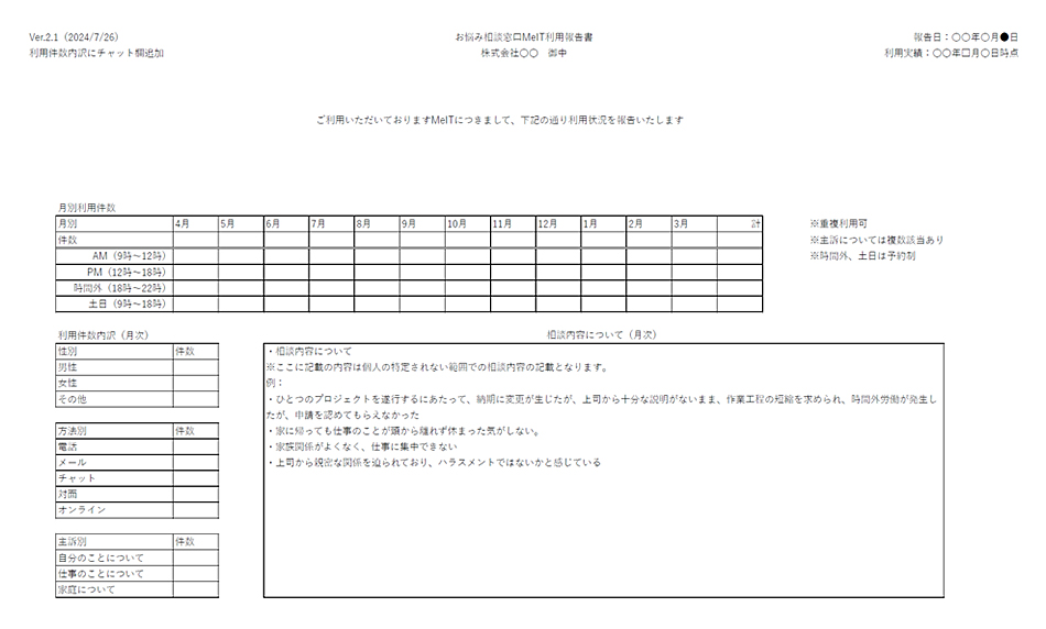 毎月、相談傾向や属性をまとめた報告書(PDF等)を提出します。システムへのログインや操作は不要。人事担当者は受け取ったレポートを確認するだけで状況を把握できます。