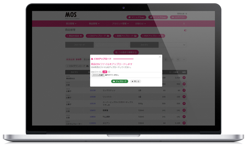 受注データのダウンロード、商品データのアップロード・ダウンロード、商品割り当てデータのアップロードなど各種データをCSVファイルで一括管理できます。