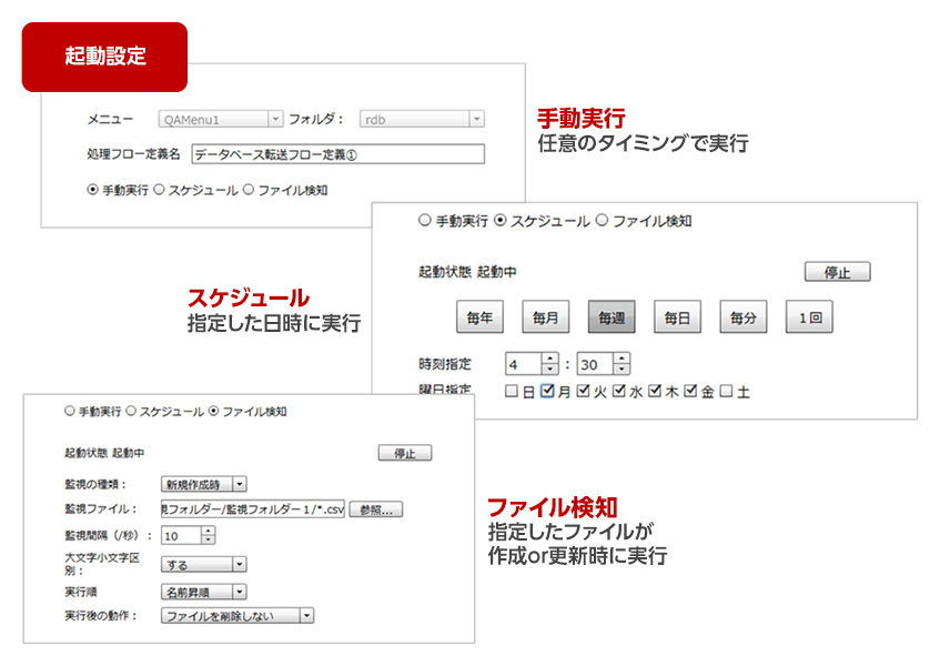 実行処理をするタイミングを簡単に設定できます。手動実行やイベント実行のほか、定期的なスケジュールを設定して実行することもできます。