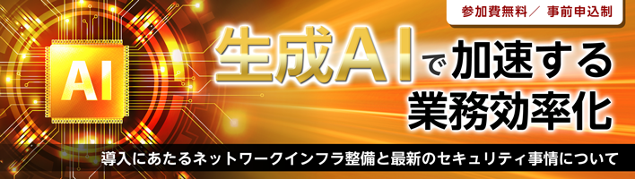 生成AIの導入が進む中、クラウドで膨大なデータを処理するなどインターネットの通信量が増加しています。そのため、業務遂行の遅延、停滞のリスクが高くなっており、安定性を考慮したネットワークインフラの整備が不可欠となっています。本セミナーでは生成AIの業務効率化を支える高速回線とネットワーク環境の構築を各機器の段階的な見直しとともにご紹介します。