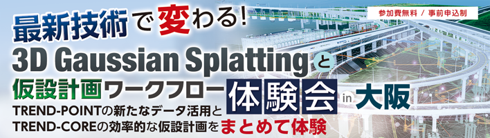 今回ご紹介するTREND-POINTの新オプション「3D Gaussian Splatting 読み込み」では、これまでにないリアルな3Dデータの再現が可能となり、点群データの活用範囲が大きく広がります。また、TREND-COREの新オプション「仮設計画支援(足場/山留)」を利用することで、従来よりも効率的で分かりやすい3次元による仮設計画の作成が可能です。本セミナーでは、これらの新機能を実際の操作を交えながら一体的に体験いただけます。