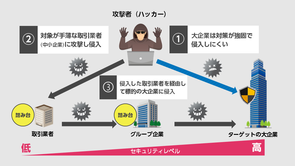 サプライチェーン攻撃で中小企業が狙われるのは、セキュリティ体制が比較的甘い傾向にあるからです。中小企業は、大企業のように専門性の高いセキュリティ担当者がいないことが多く、予算や人的リソースを割きにくいのが実情です。攻撃者にとって、中小企業は「防御が手薄な入り口」だと言えます。