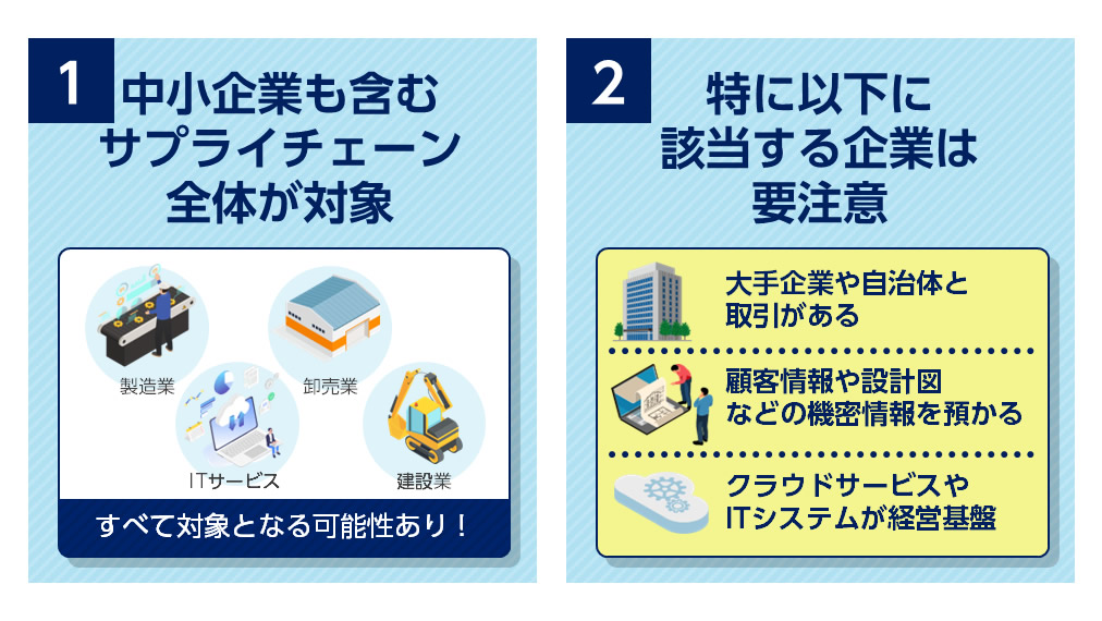 対象となるのは、サプライチェーンを構成するすべての企業で、中小企業ももちろん対象に含まれます。特に、大手企業や自治体と取引のある企業、顧客情報などの機密情報を保管している企業、クラウドサービスやITシステムを経営基盤としている企業は、取り組みが必要になる可能性が高いでしょう。