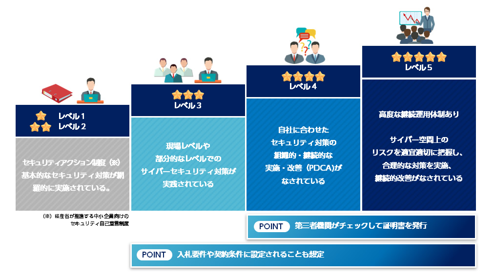 今回の評価制度は、こうした課題の解消にもつながります。セキュリティ対策の基準が共通化されることで、企業ごとのセキュリティ対策状況が把握しやすくなります。また、第三者からの評価も制度に盛り込むため、高レベルのセキュリティ対策を講じている企業が一目瞭然になるのです。